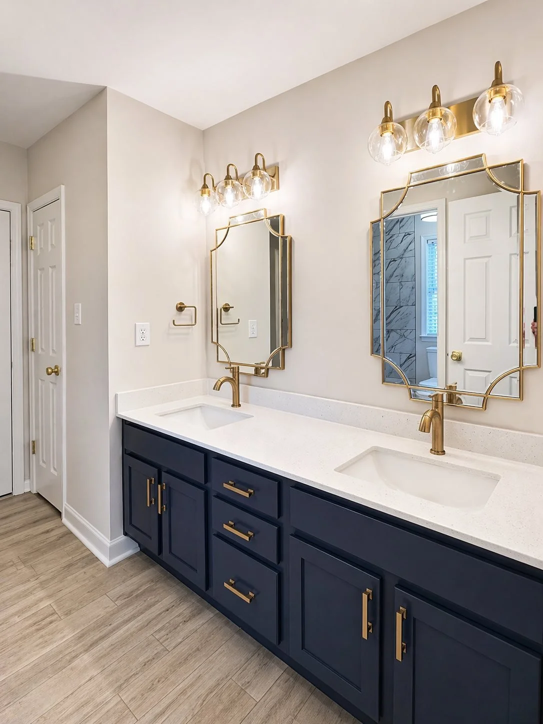 Installed brushed gold plumbing fixtures including faucets and shower systemInstalled decorative vanity mirrors with coordinating finishesInstalled modern vanity lighting above each mirrorInstalled coordinating cabinet hardware and bathroom accessoriesInstalled upgraded door hardware to match overall design aesthetic
