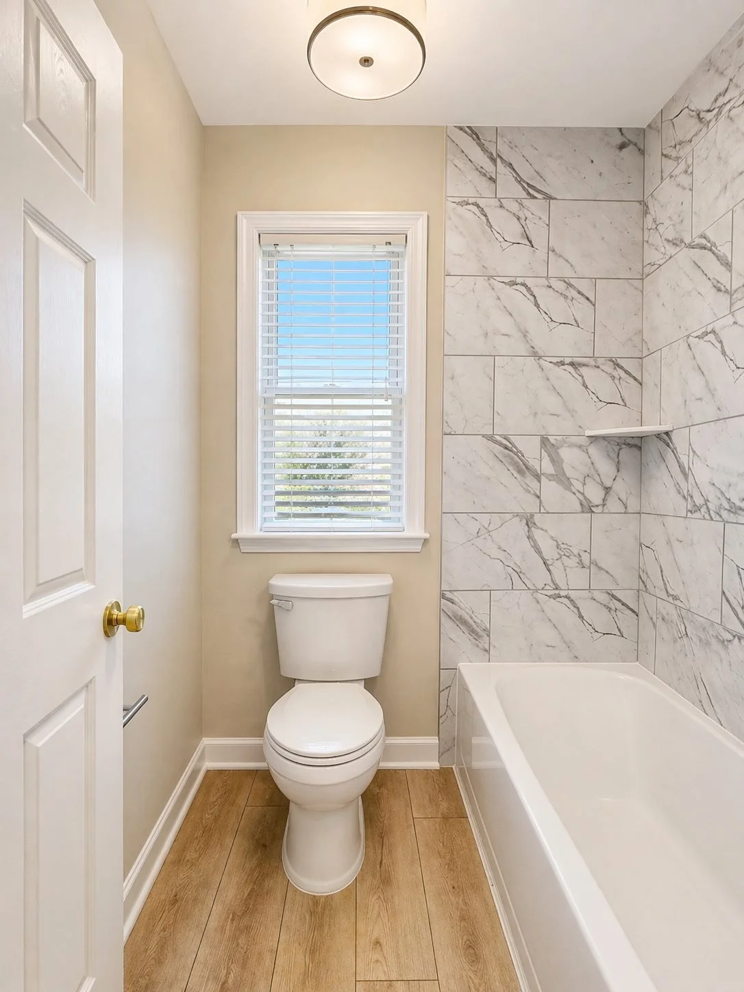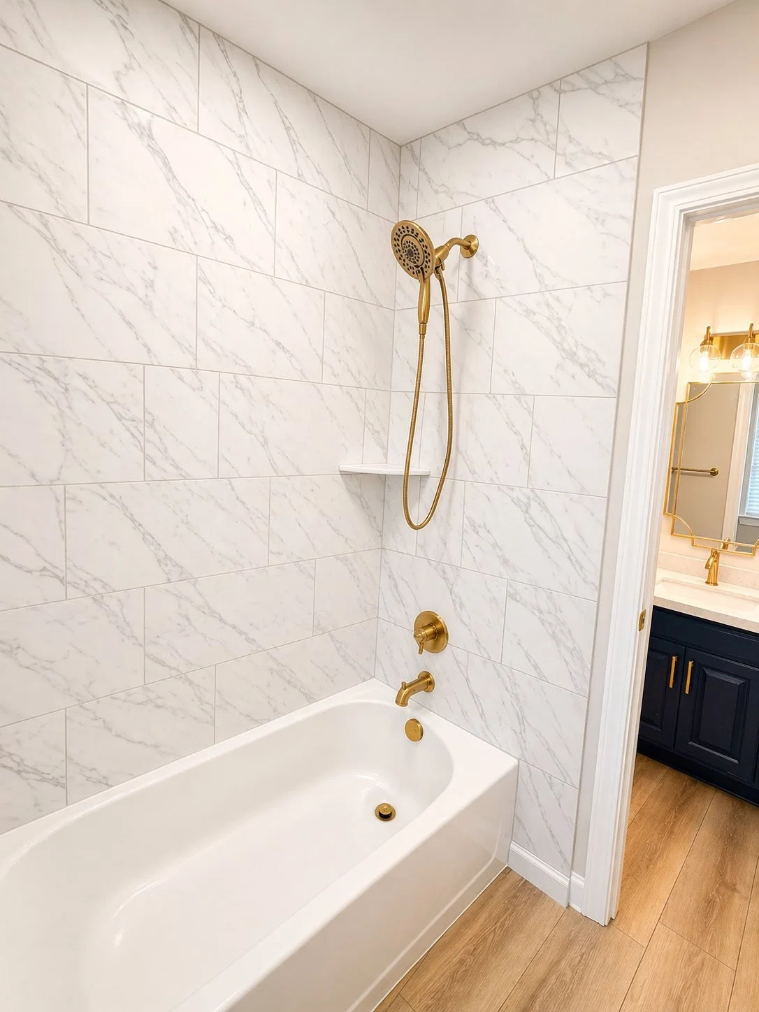 Installed new bathtub with updated plumbing fixturesInstalled large-format marble-look tile surround on shower wallsIntegrated recessed shower niche for functionalityCompleted waterproofing system for long-term durability
